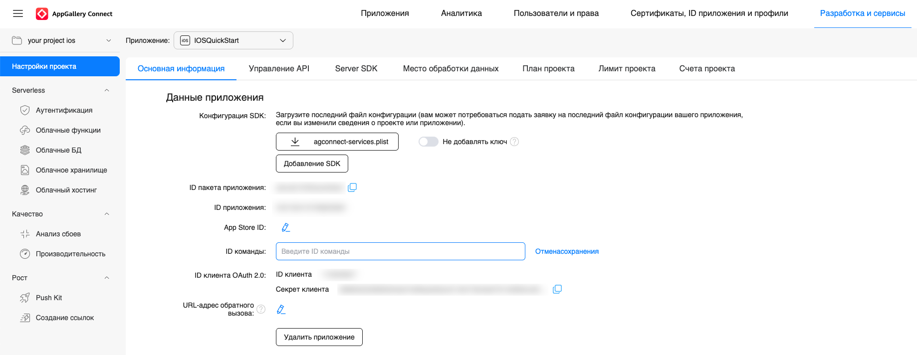 Чуть ниже перейдите в настройки Huawei и укажите ID приложения, ID клиента OAuth 2.0 и секрет клиента OAuth 2.0: