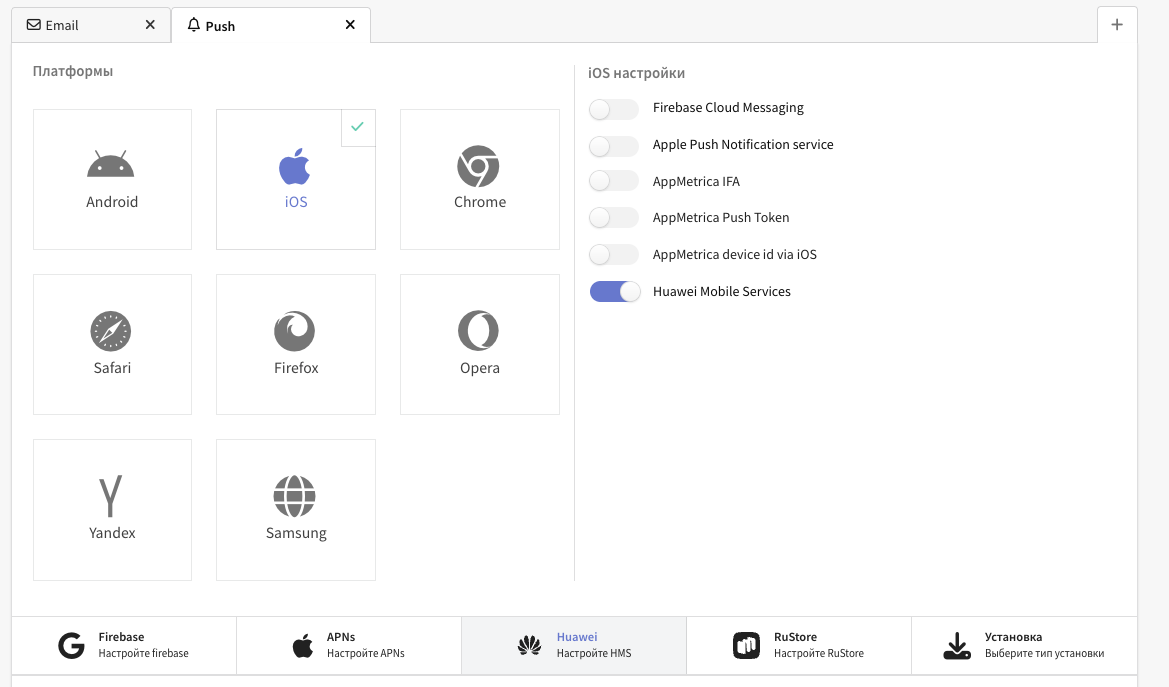 В платформе Altcraft создайте ресурс или добавьте к существующему новый канал коммуникации — Push. Затем в настройках ресурса выберите платформу iOS и активируйте переключатель Huawei Mobile Services: