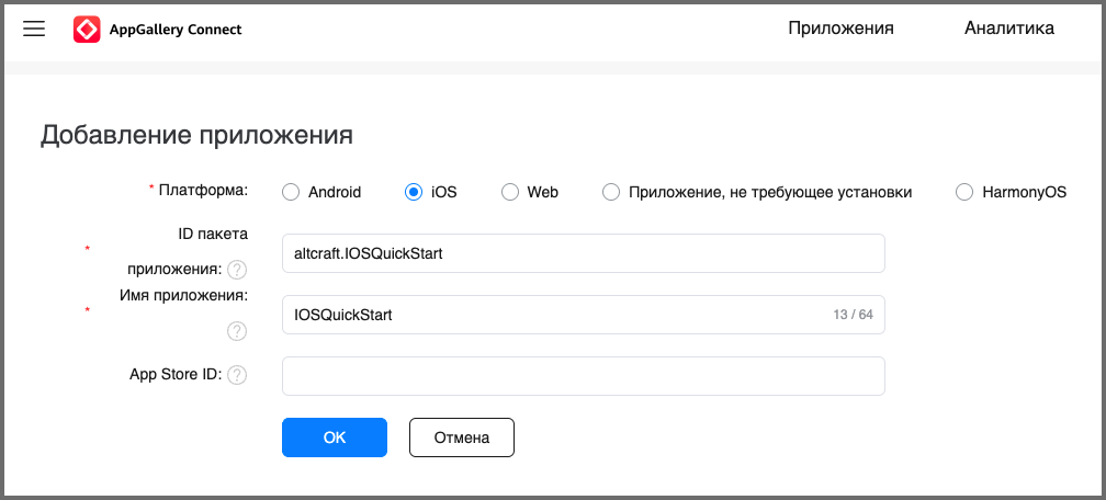Укажите данные о вашем приложении: