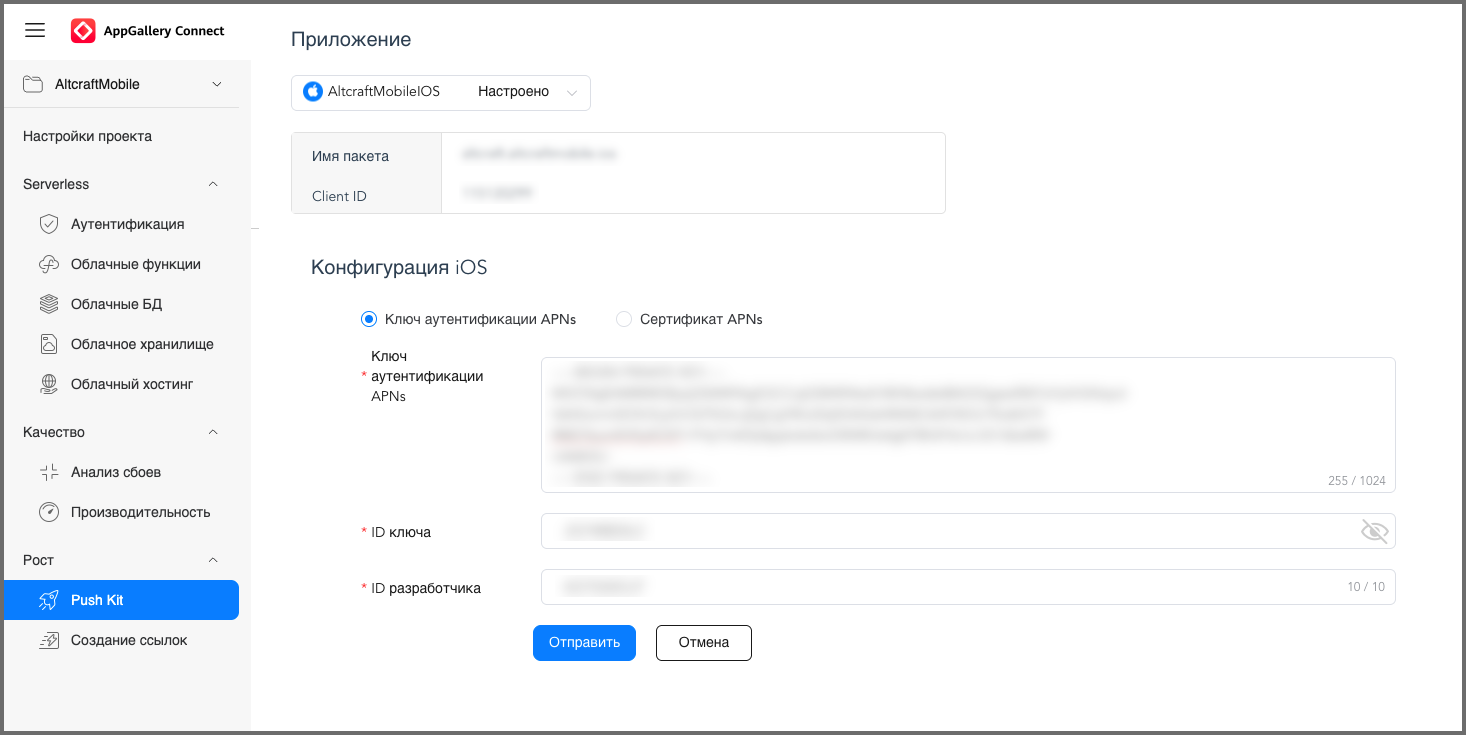 Далее перейдите в раздел PushKit — Настройки — Приложение — Конфигурация IOS — Включить. В открывшейся конфигурации IOS укажите: