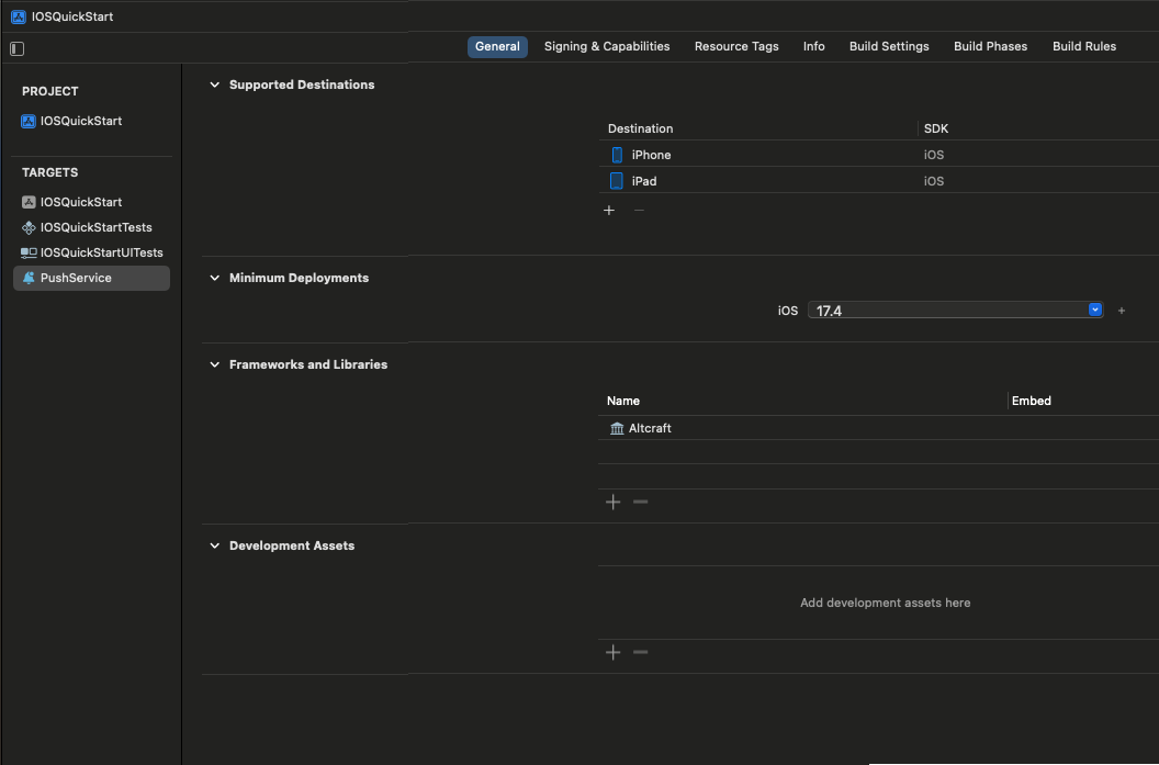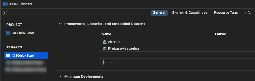 - Проверьте, что библиотека Altcraft добавлена в Frameworks, Libraries, and Embedded Content таргета приложения: