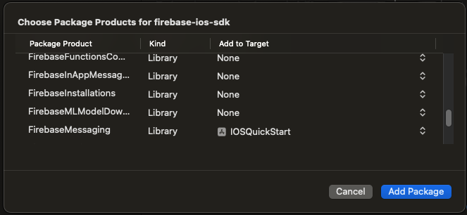 - Проверьте, что библиотека FirebaseMessaging добавлена в Frameworks, Libraries, and Embedded Content таргета приложения: