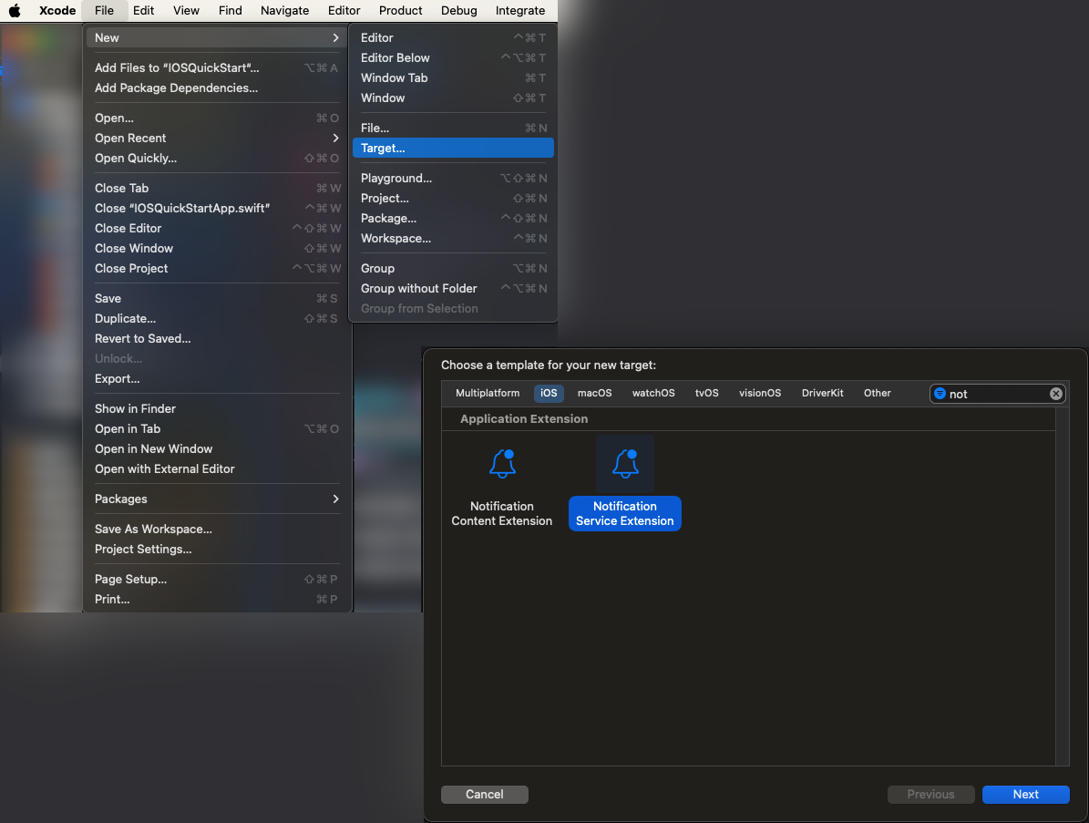- Выполните File — New — Target — Notification Service Extension;