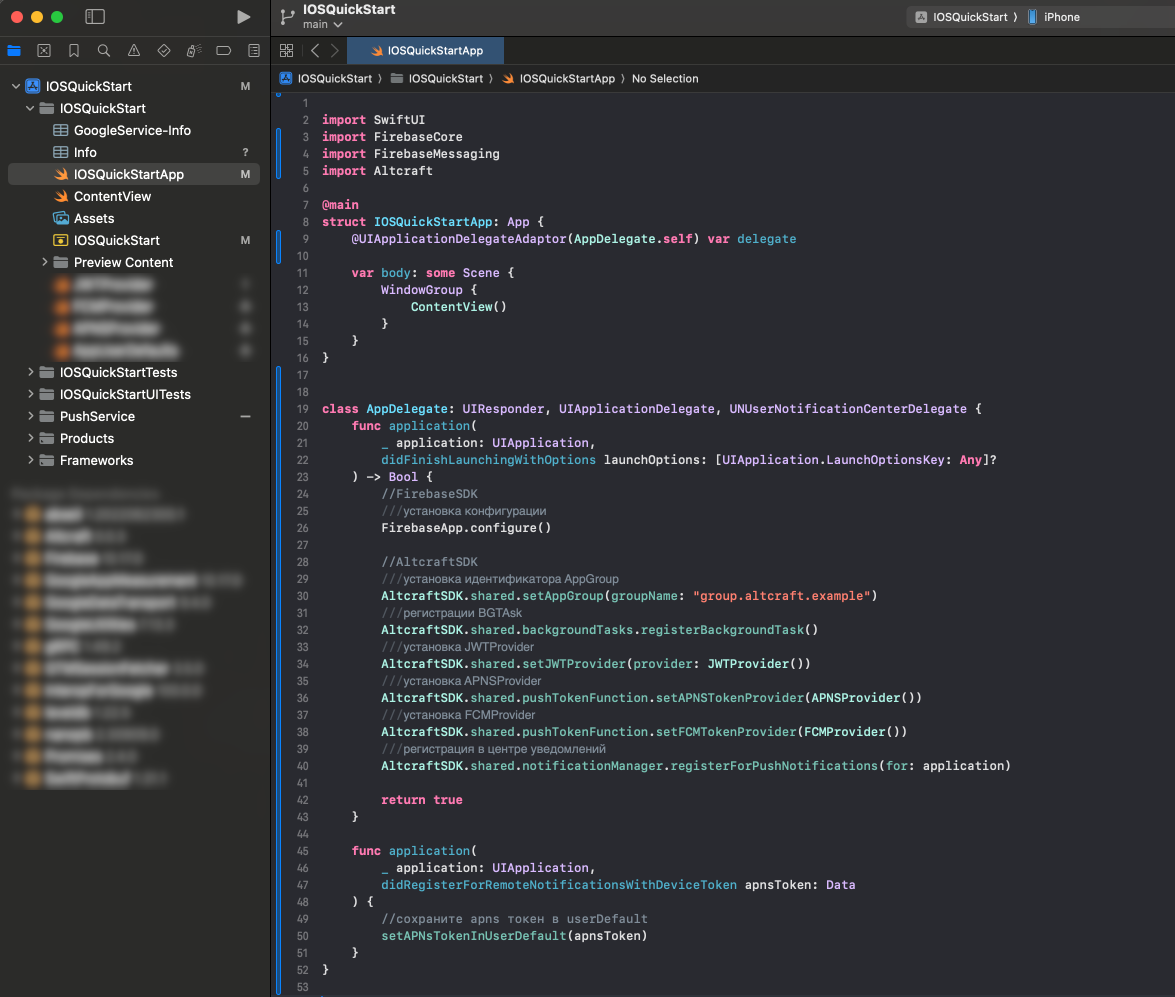 Шаг 5. Настройка Altcraft SDK и Firebase SDK в AppDelegate