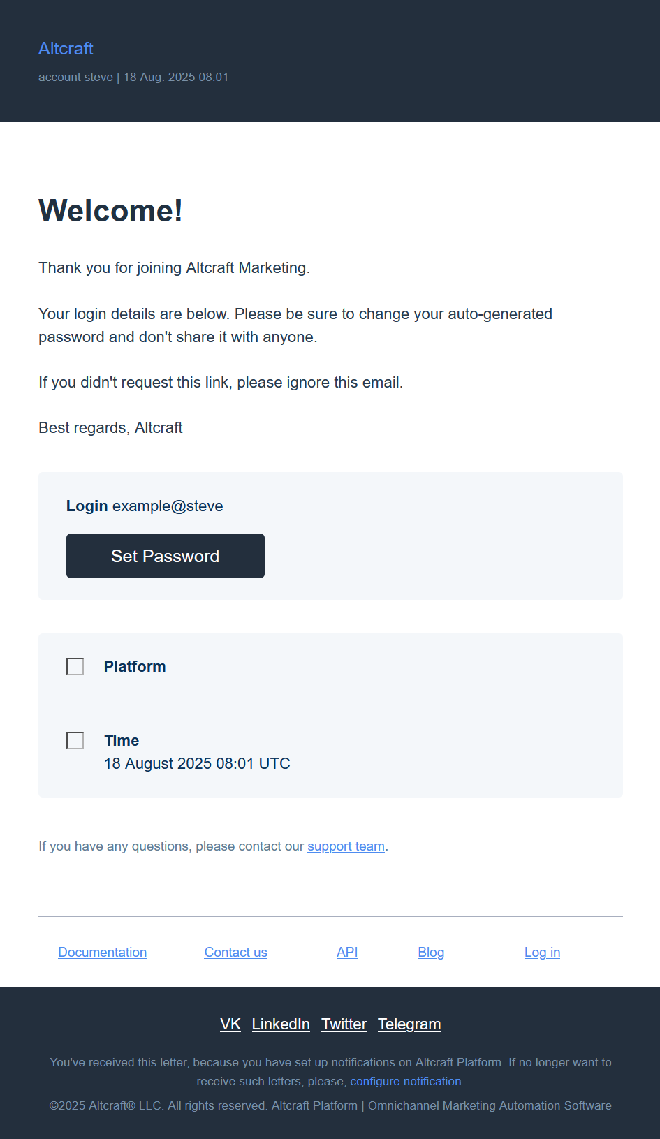 Sends a welcome email with a link to set a password. The email provides personal data about the initiator of the recovery/registration completion operation:
