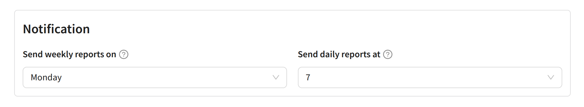 Additionally, you can set the day of the week for sending weekly email reports to account users (Send weekly reports on) and the hour for daily reports (Send daily reports at):
