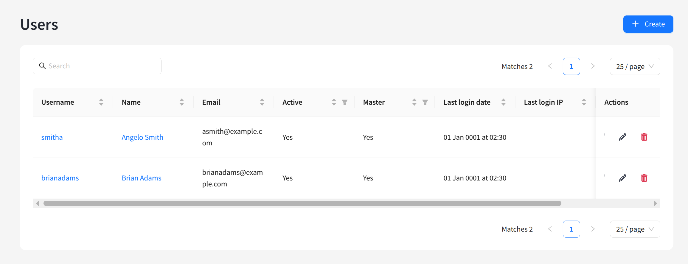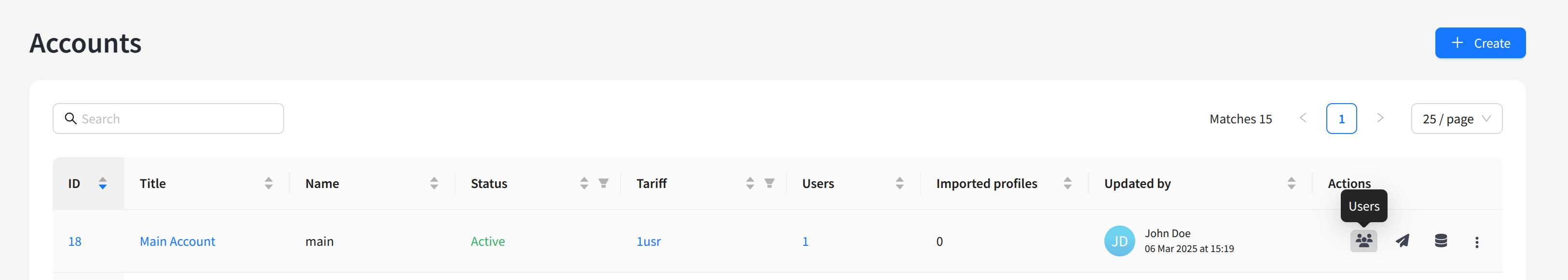 The list of users will open displaying existing accounts. On the right side of the table, there are buttons for logging in as the user, editing, and deleting accounts. You can also click the user account identifier on the left to edit. To create a new account, click + Create: