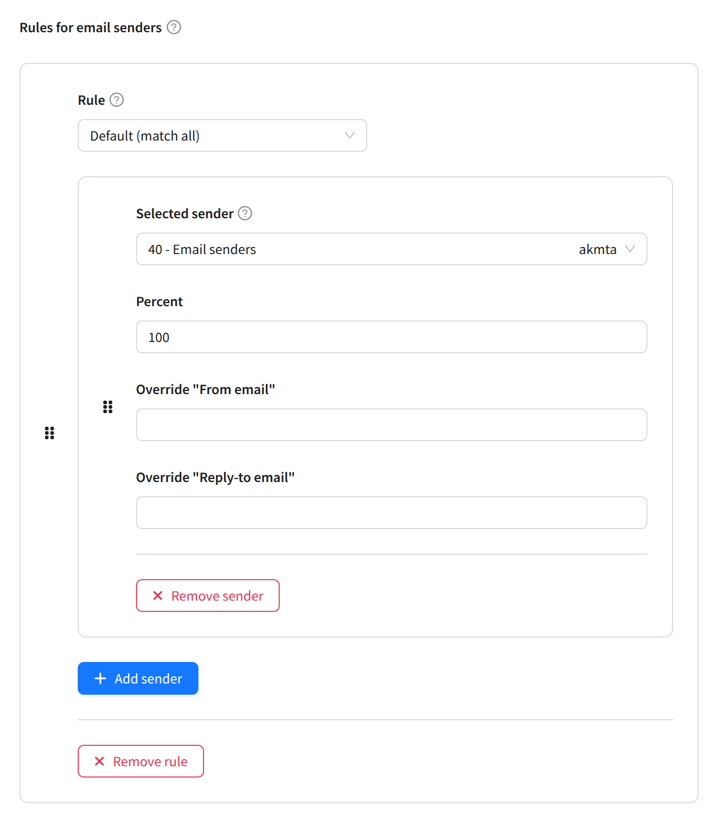 Email sender rules determine which real senders and in what proportions will be used under certain conditions. To add a rule, click + Add rule.