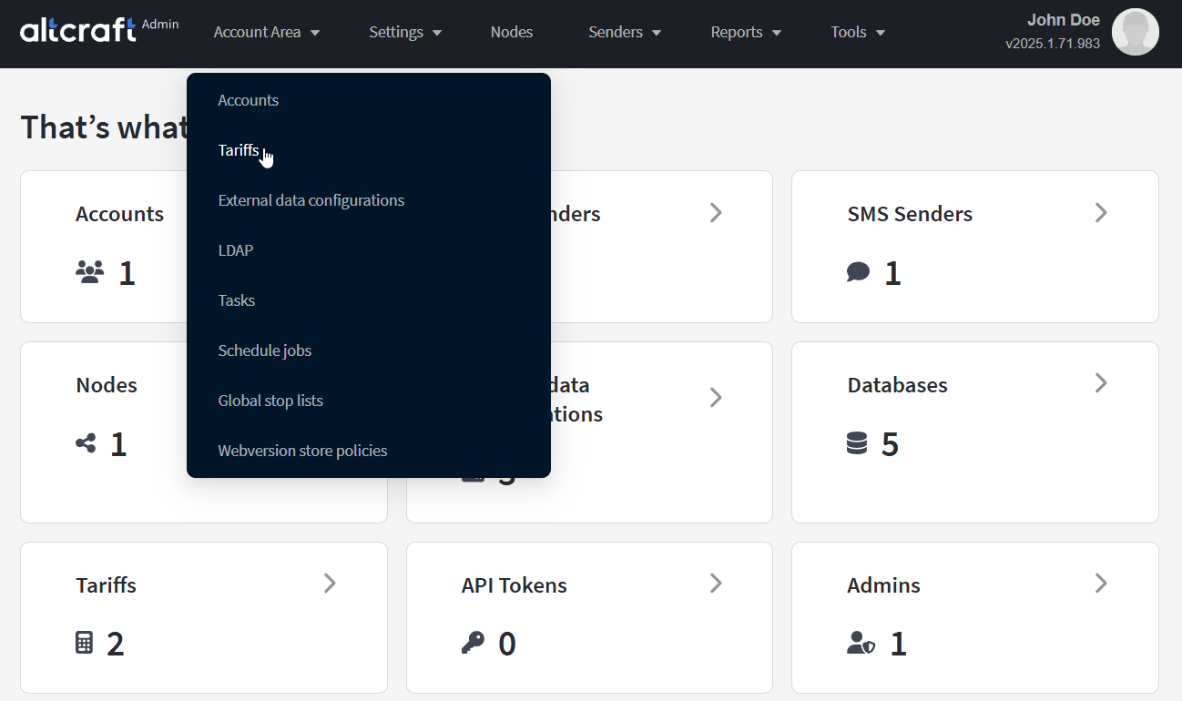 A tariff is a set of limits for a platform account. The license agreement for the Altcraft marketing platform does not impose any restrictions on data usage, but you can set your own limits for specific platform accounts.