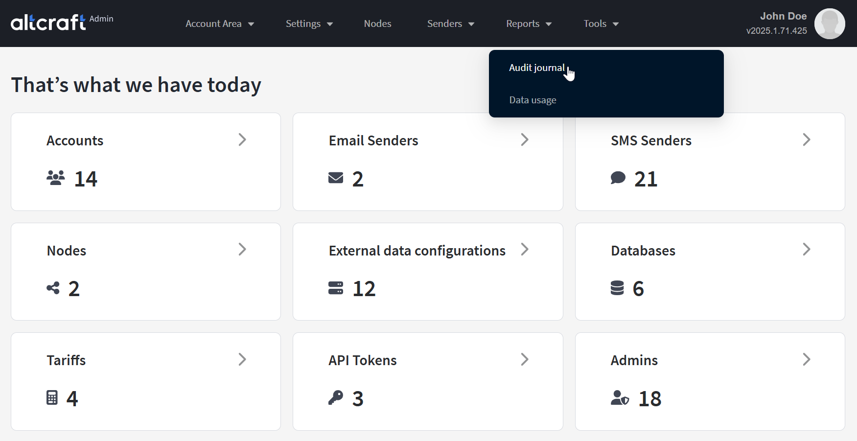 The Audit Journal is an important security component of the Altcraft platform. It collects information about the actions performed by platform administrators on various objects in the Administrative Panel.