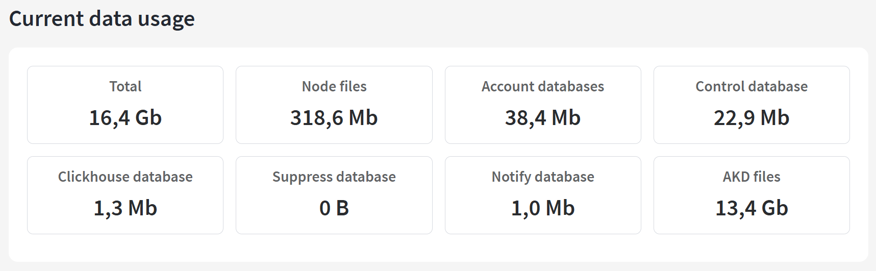 Data Usage is a section designed to view the volume of data used in the platform. It contains information about the current data volume, its distribution across different system components, and the dynamics over the past 30 days.