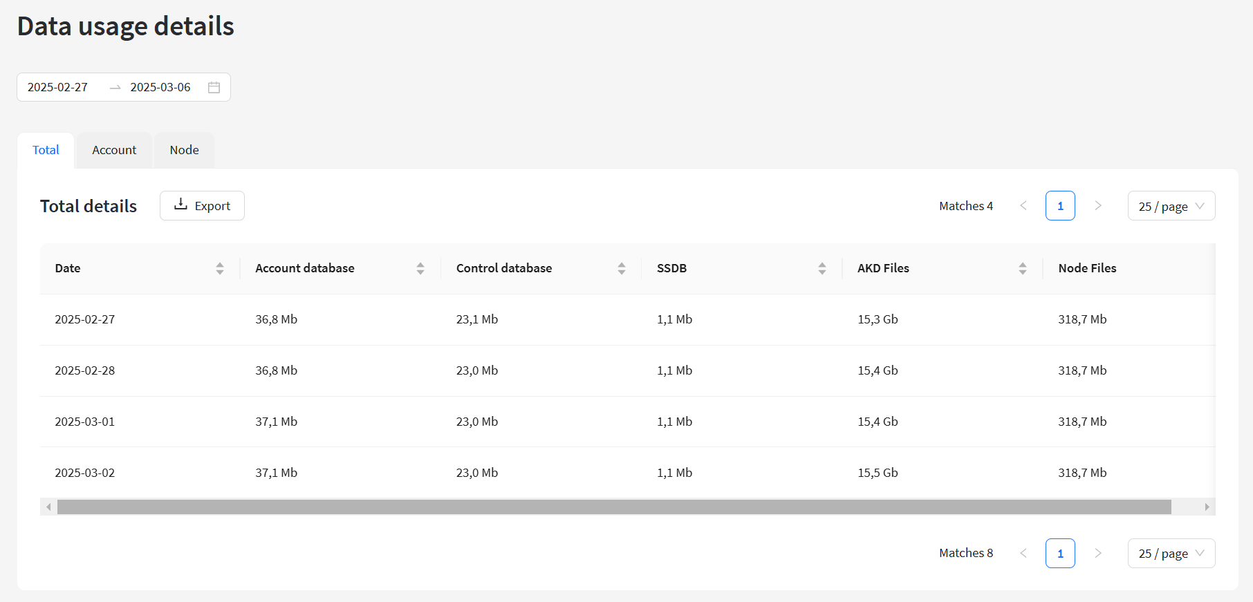 The Data Usage Details section provides detailed information about the distribution of data across different categories for the selected period. It contains a table with daily statistics, including: