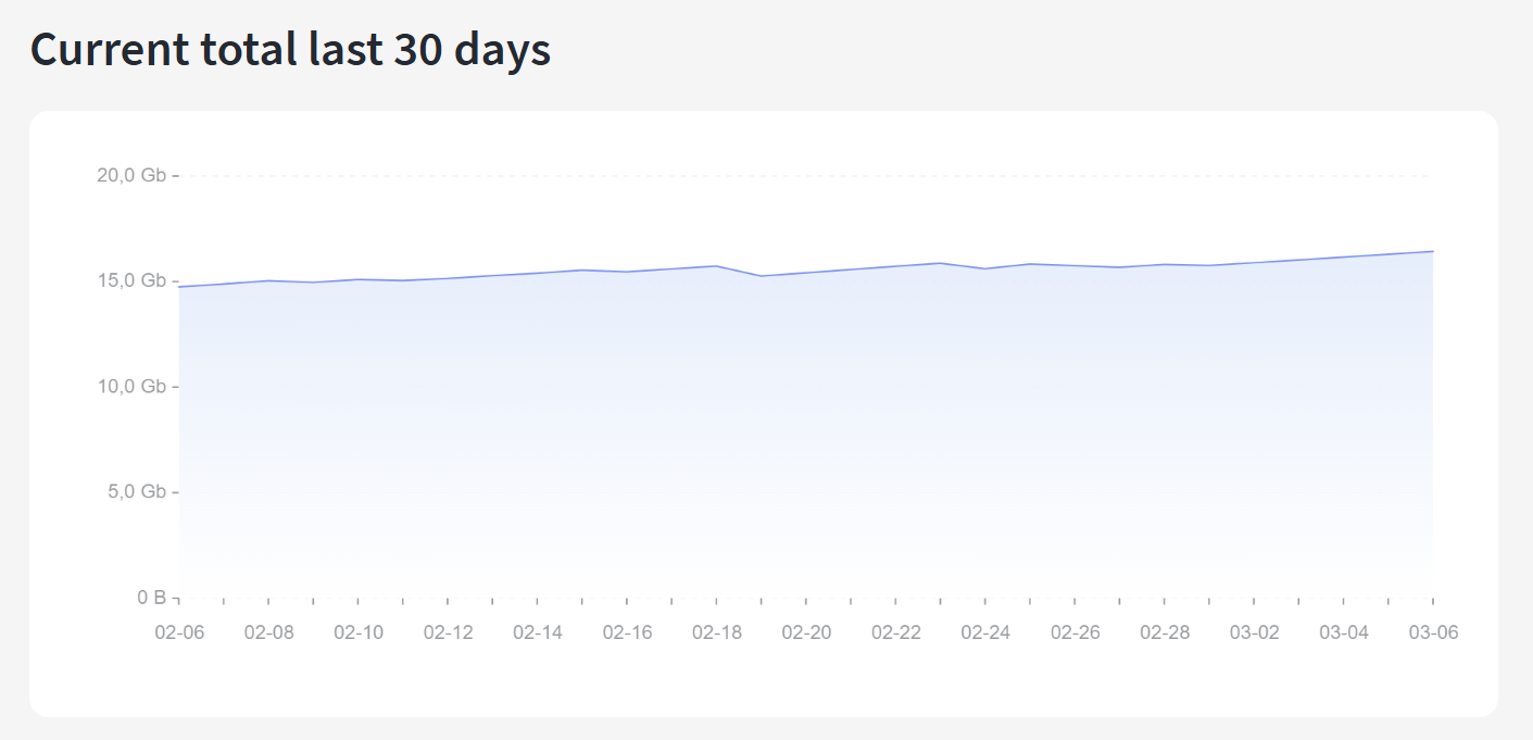 The graph shows the dynamics of changes in data volume over the past month. It displays the total volume of data per day, which helps analyze and forecast storage requirements.