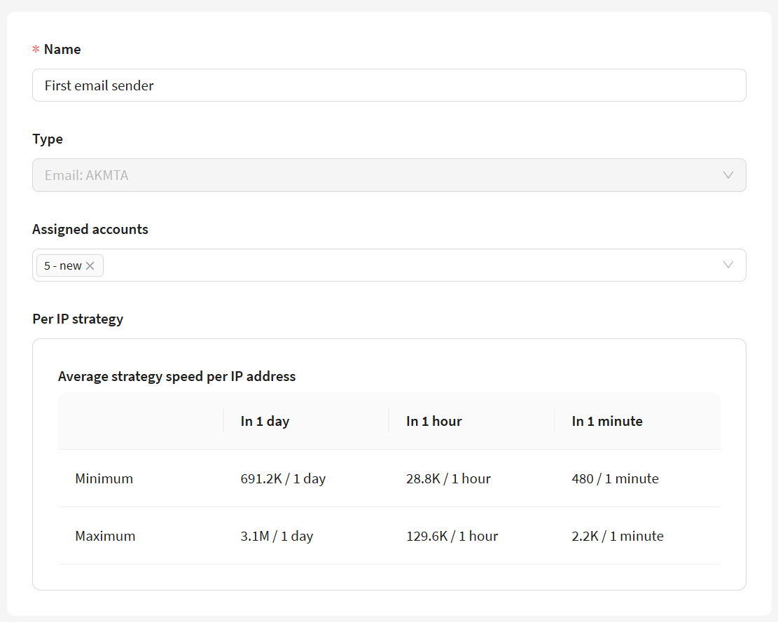 When selecting the built-in delivery module (Type - Email: AKMTA), the MTA configuration settings for the current sender will open.