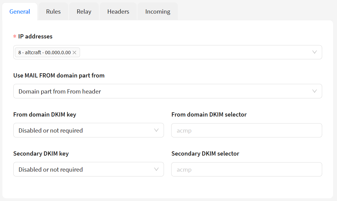 In the General block, you configure sender domains and IP addresses. The following parameters are available: