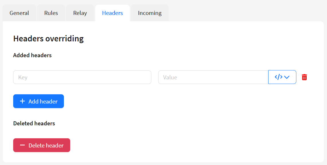 In this section, you can configure header overriding. In the left field, enter the header name, and in the right field, the header value.