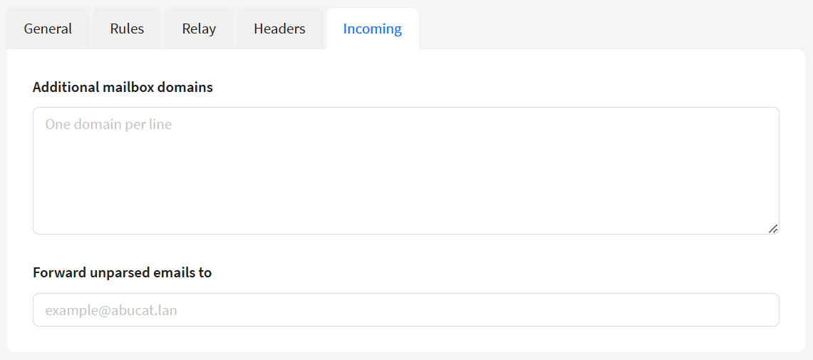 In the Incoming section, you can specify additional mail domains and email addresses for unparsed emails.