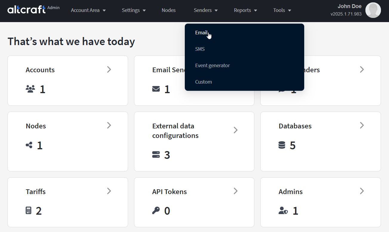 Sender in Altcraft is a configuration of the message delivery service. Senders are configured for email and SMS communication channels. As an email sender, Altcraft Mail Transfer Agent (AKMTA) can be used — a built-in email delivery module with extensive configuration capabilities.