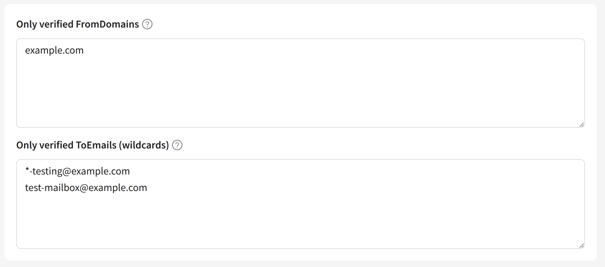 - Allowed only on specified TO emails — sending will only occur to the specified email addresses. You can use the * symbol, which will match any set of characters. Each address must be specified on a separate line.