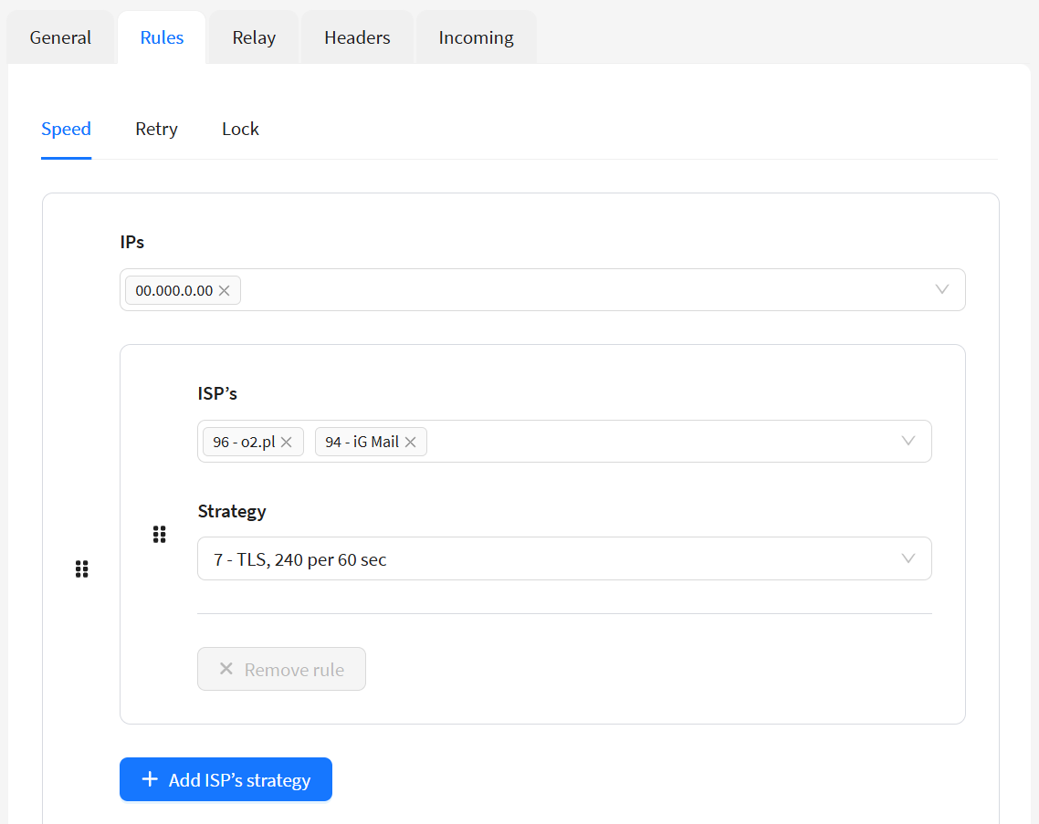 You can separately control the sending speed for different IPs, different email providers, and combinations of IPs and ISPs. To control the sending speed from IP addresses, click Add rule under the speed calculation table.