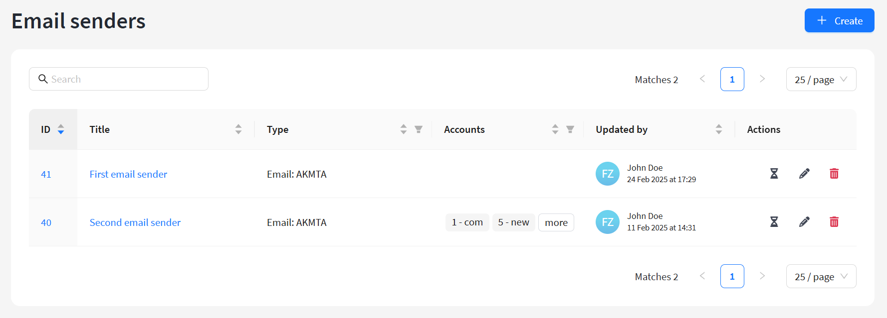 The opened sender list displays existing senders. On the right side of the table, there are edit and delete buttons. You can also edit by clicking the sender ID (on the left). To create a new sender, click Create.