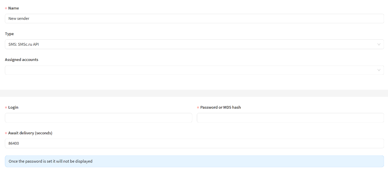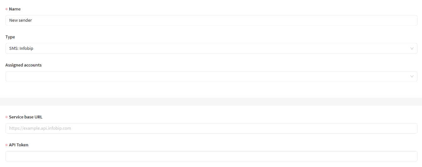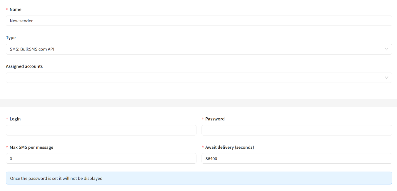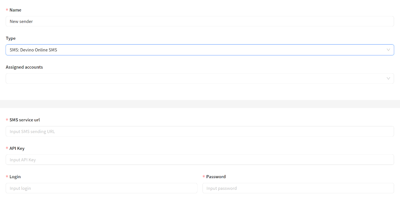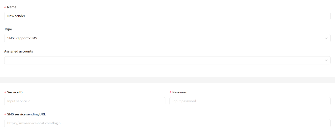 When selecting one of the SMS gateways as the delivery service, you must fill in the configuration fields (fields may vary depending on the selected gateway).