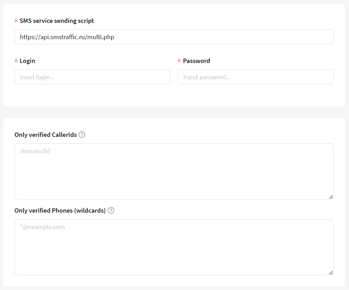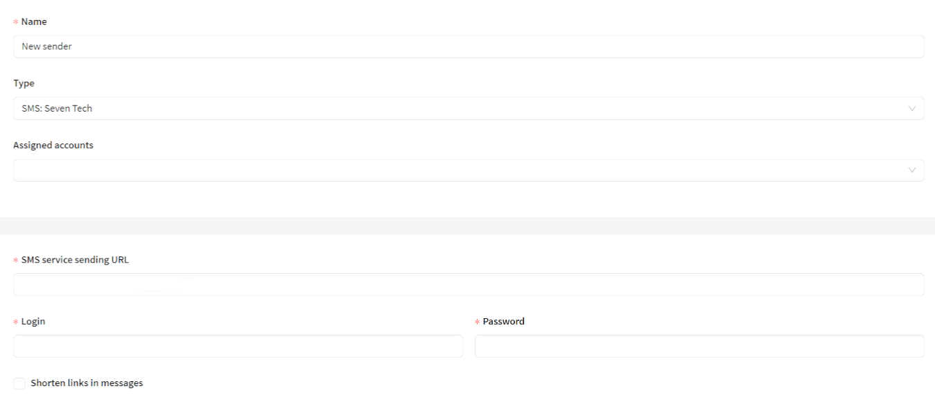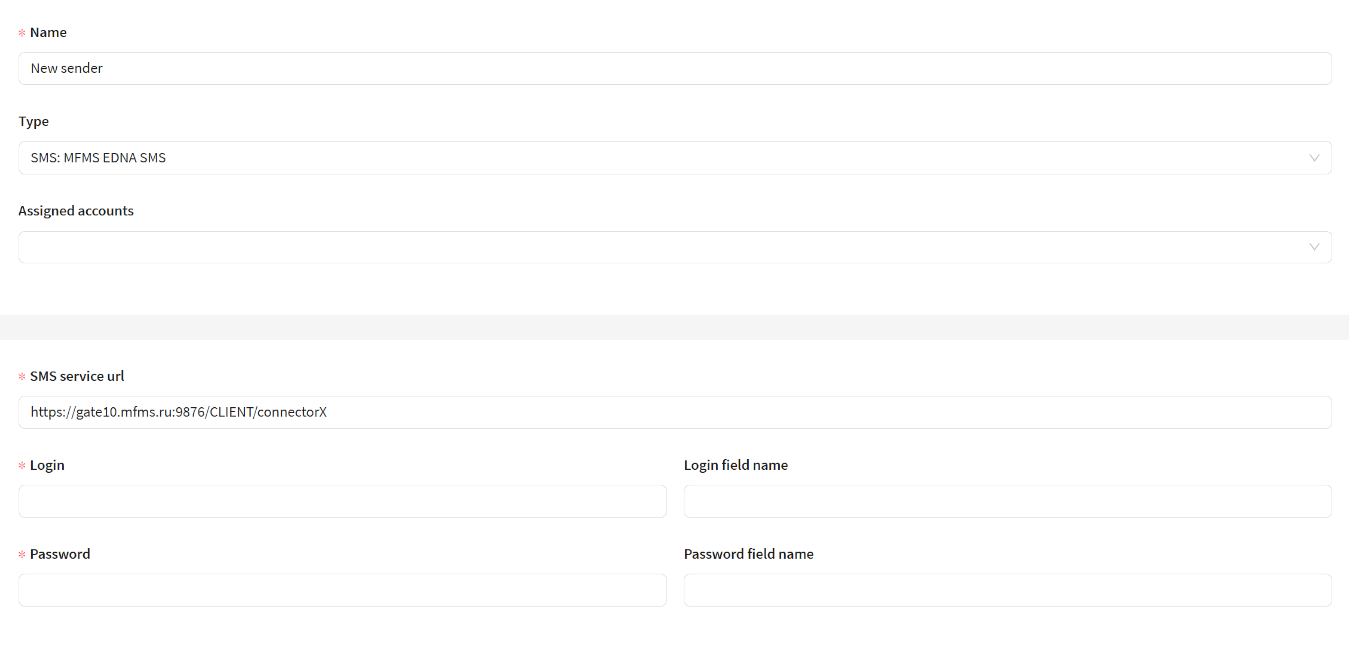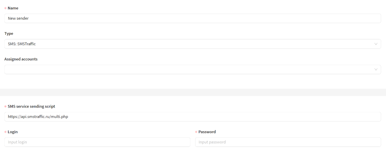 When selecting one of the SMS gateways as the delivery service, you must fill in the configuration fields (fields may vary depending on the selected gateway).
