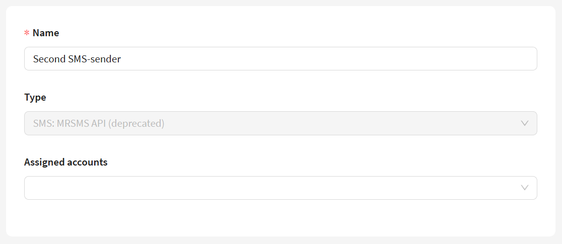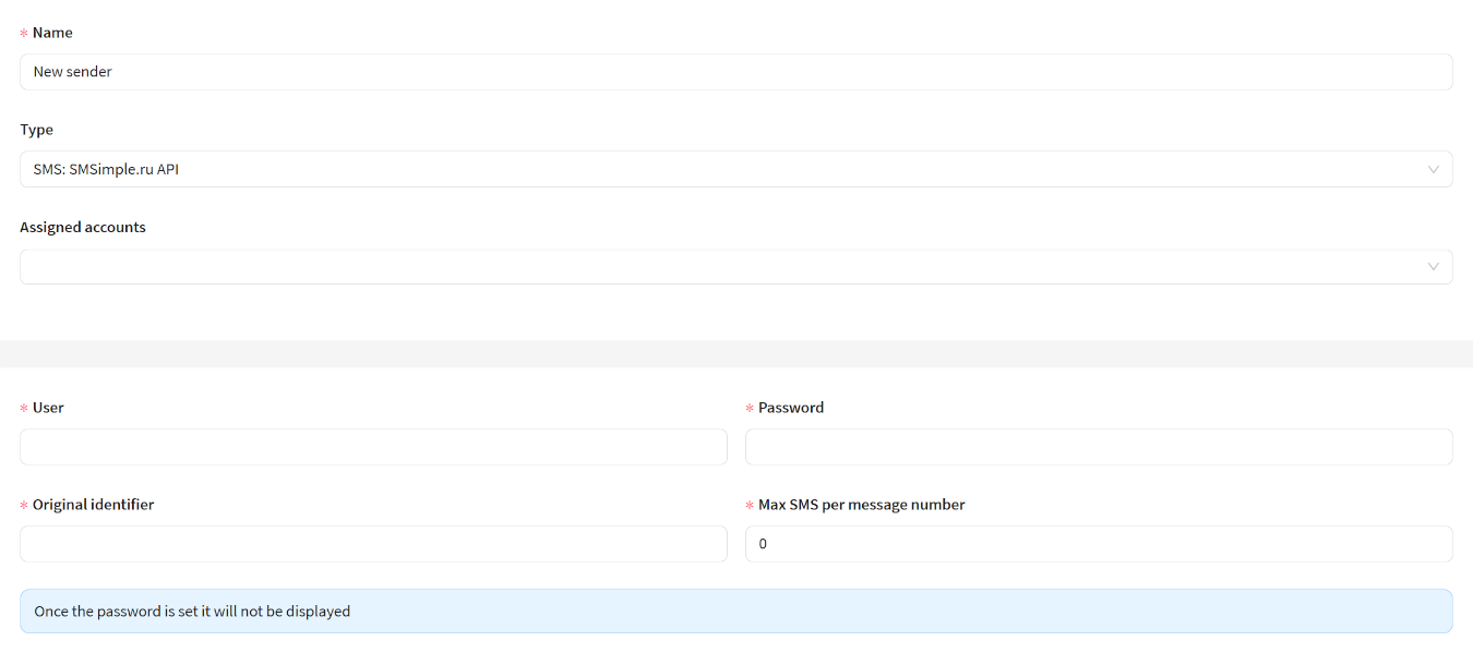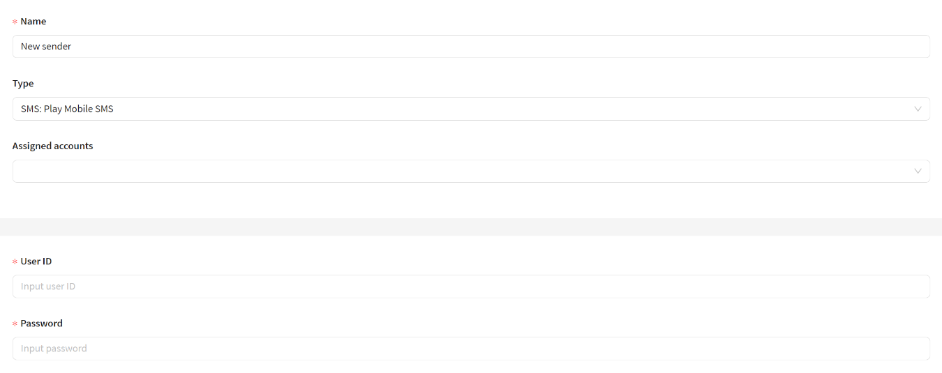 For a new sender, in the Name field specify a unique name, and in the Assigned accounts menu select platform accounts that will be able to use the sender for delivering messages: