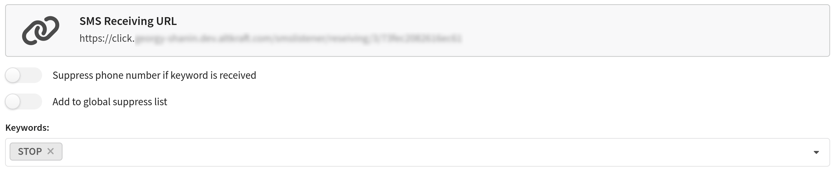 Infobip provides a feature to stop sending messages to a phone number that replies with a stop word. After saving the SMS sender, an SMS Receiving URL will appear on the screen. You need to specify it in the account settings.