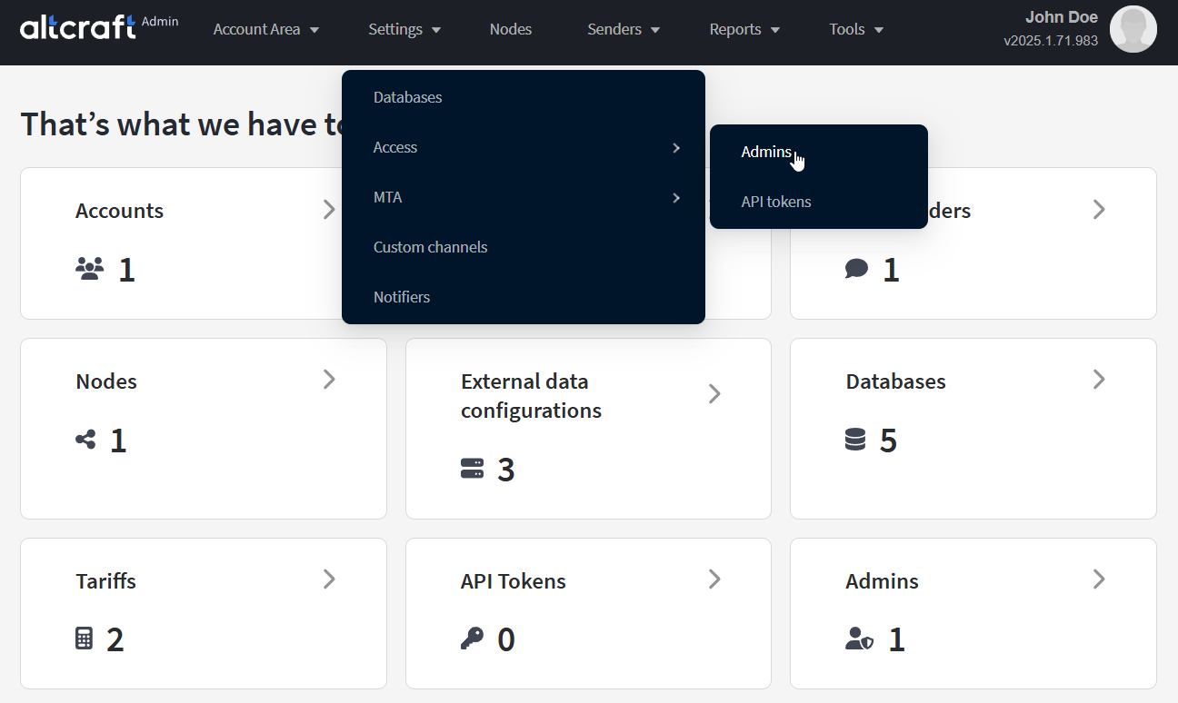 Administrator in Altcraft is an account in the Admin Panel. Administrator records are created separately from user accounts of the platform. However, each administrator can access any account within the platform.