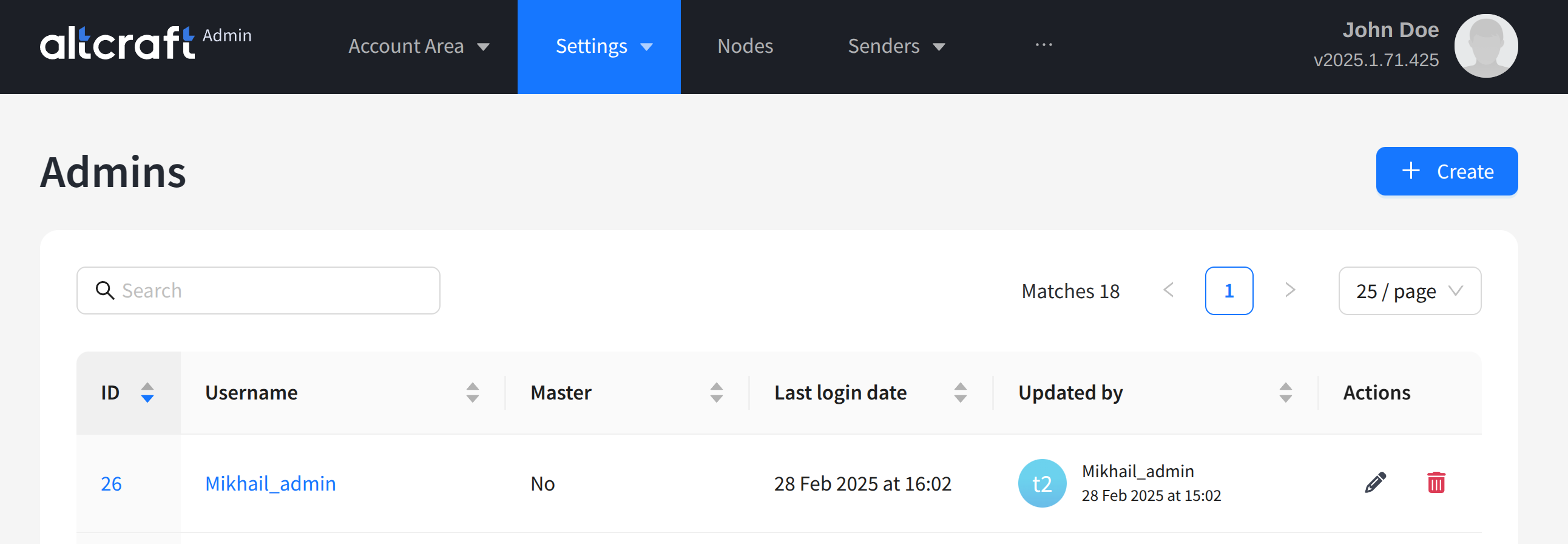 The opened list displays existing administrator accounts. On the right side of the table, there are edit and delete buttons. You can also edit by clicking the identifier or name of the administrator account (on the left). To create a new account, click + Create: