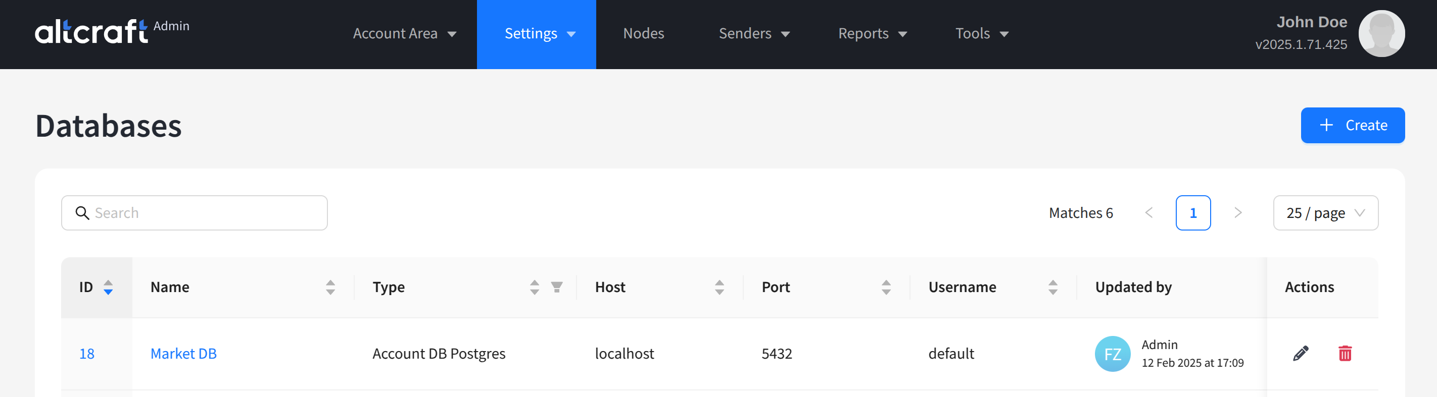 Databases is a section in the Altcraft platform designed for managing connections. In this section, you configure connectors to various databases used for storing data about orders, products, user statistics, and reports.