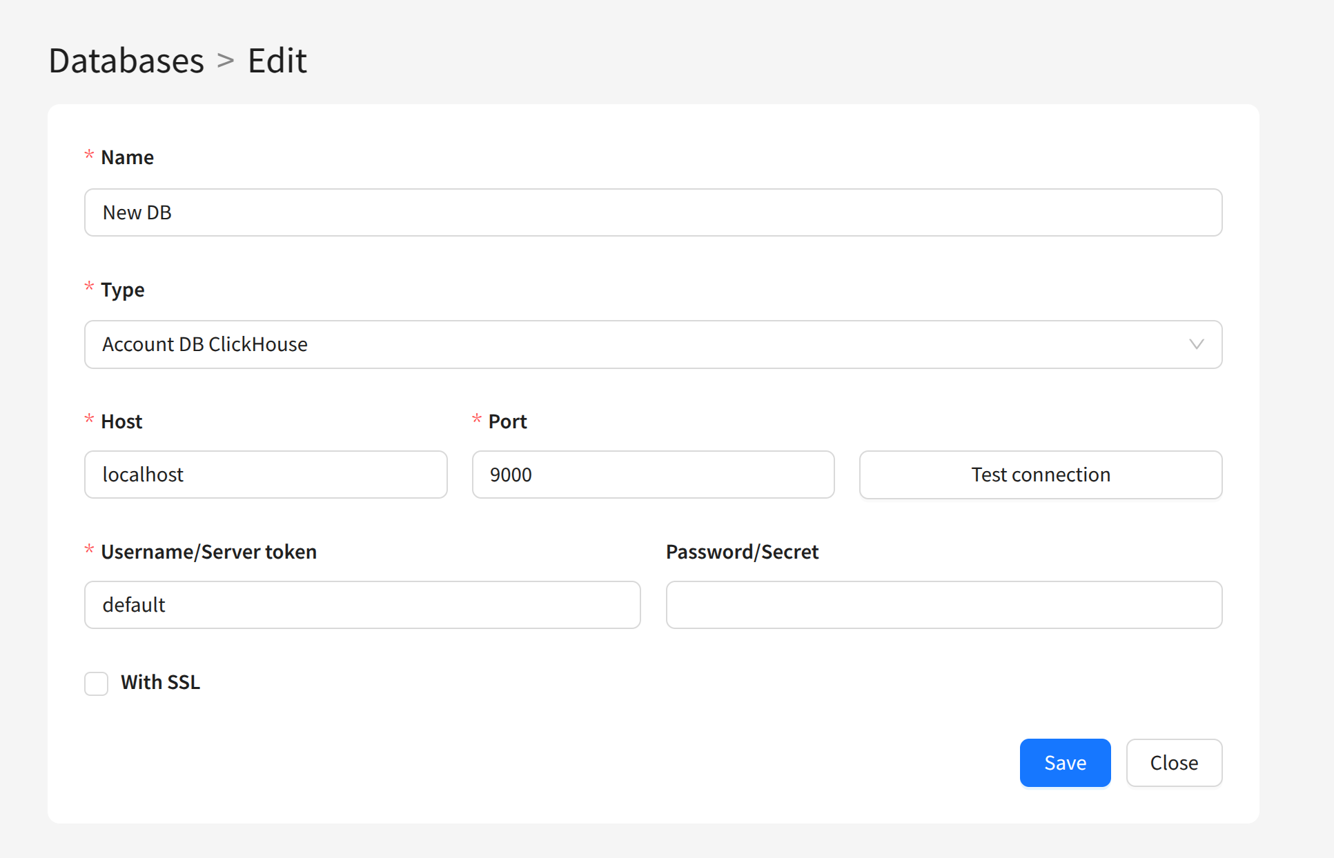 For ClickHouse databases, you can enable SSL support. To do this, activate the Via SSL connection parameter and fill in the necessary fields: