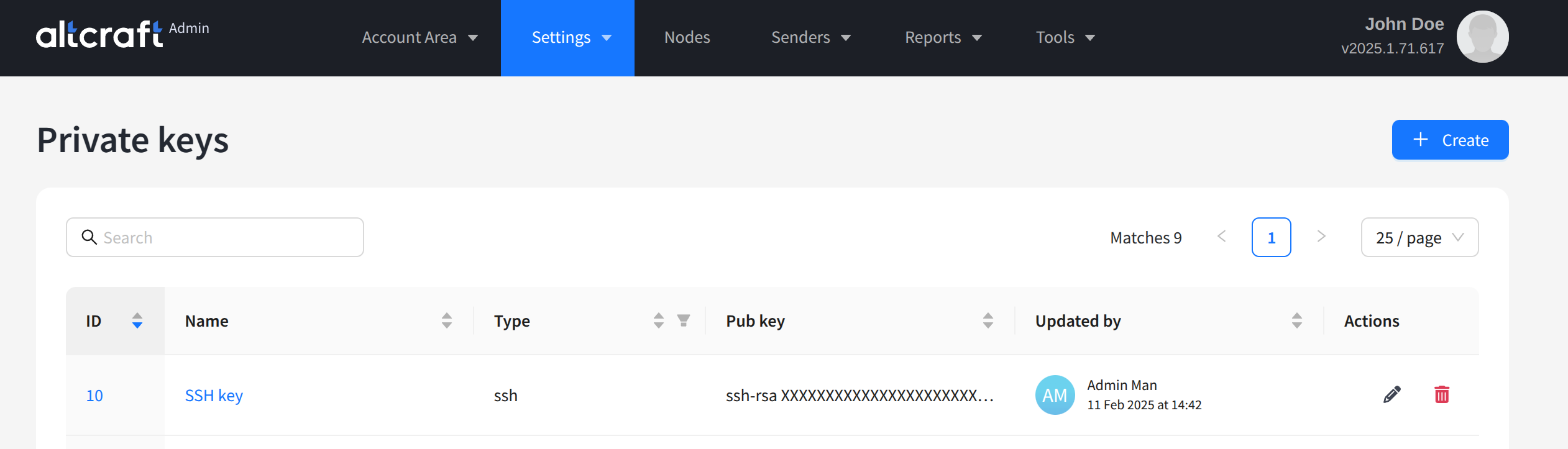 The opened list displays existing SSH and DKIM key pairs. On the right side of the table are the edit and delete buttons. You can also open editing by clicking the key identifier or name on the left. To create a new key pair, click + Create: