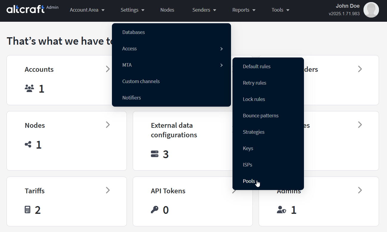 To manage pools, in the main menu select Settings — MTA — Pools.
