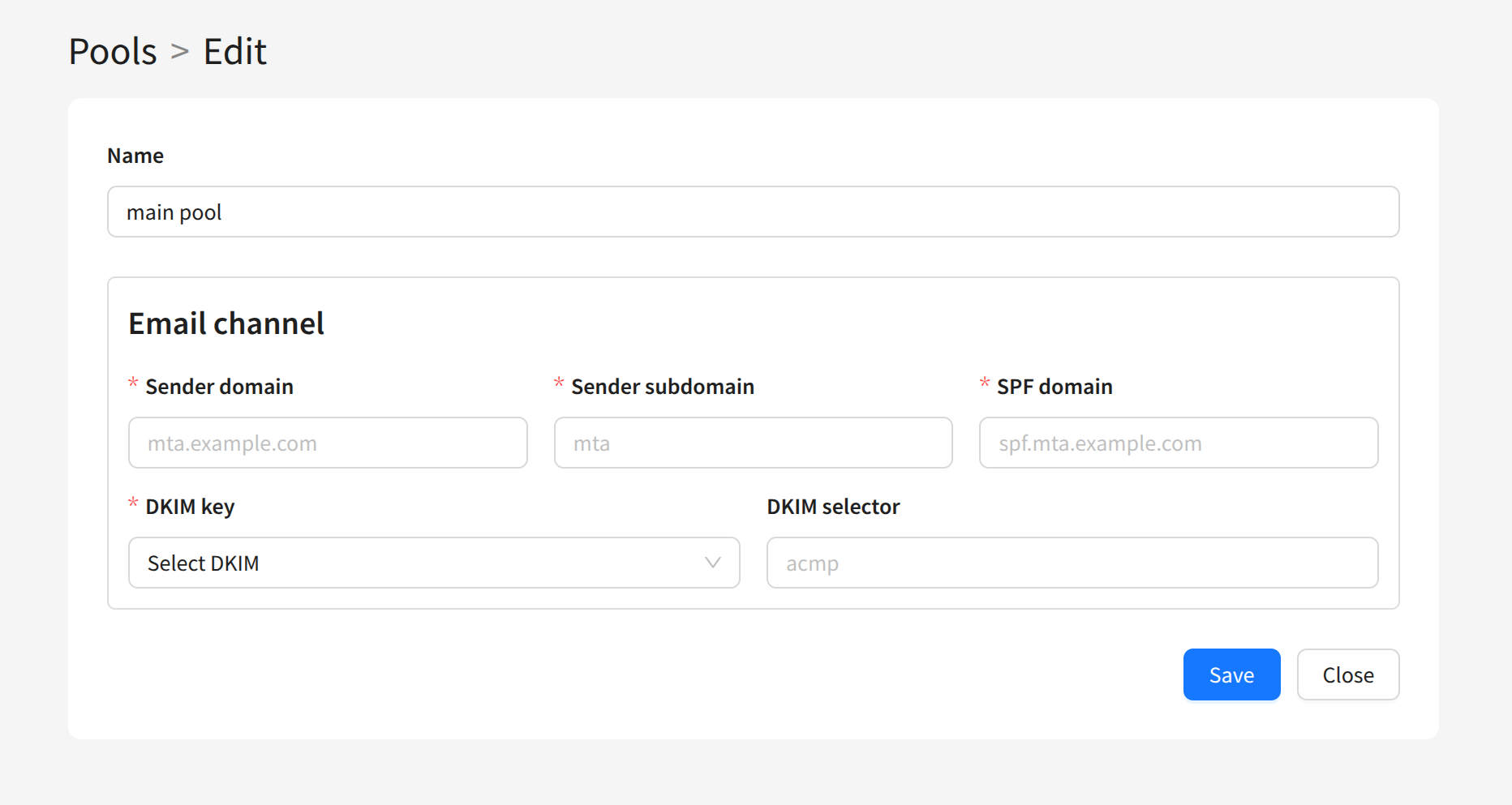 A Pool is a set of resources required to send emails from a specific domain. The pool allows you to simultaneously track sending statistics and perform SPF alignment.