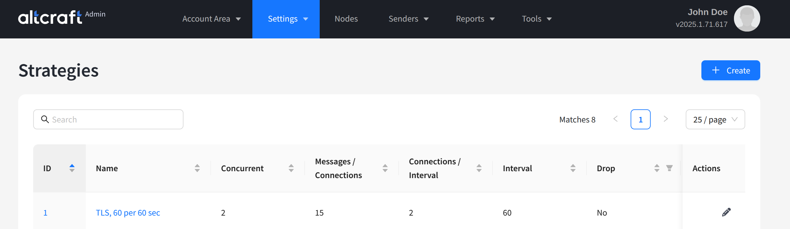 The opened list displays existing AKMTA sending strategies. By default, the system has a 60:60 strategy — 60 messages every 60 seconds. On the right side of the table are the edit and delete buttons. You can also edit a strategy by clicking its identifier or name on the left. To create a new strategy, click + Create.
