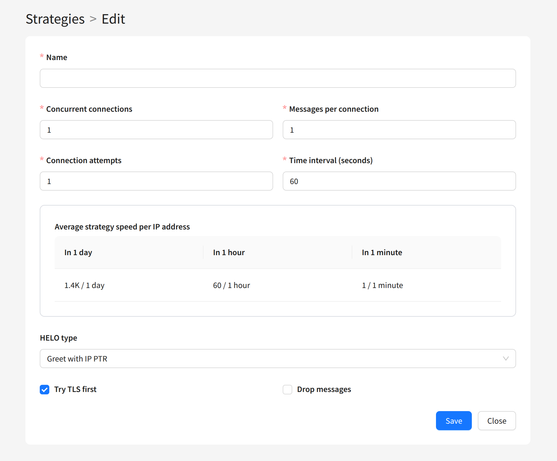 Strategies are a set of rules and settings that define message delivery parameters via AKMTA strategy. They control the sending speed, depending on the number of IP addresses of the sender and the selected sending strategies (for different IP addresses or different ISPs).