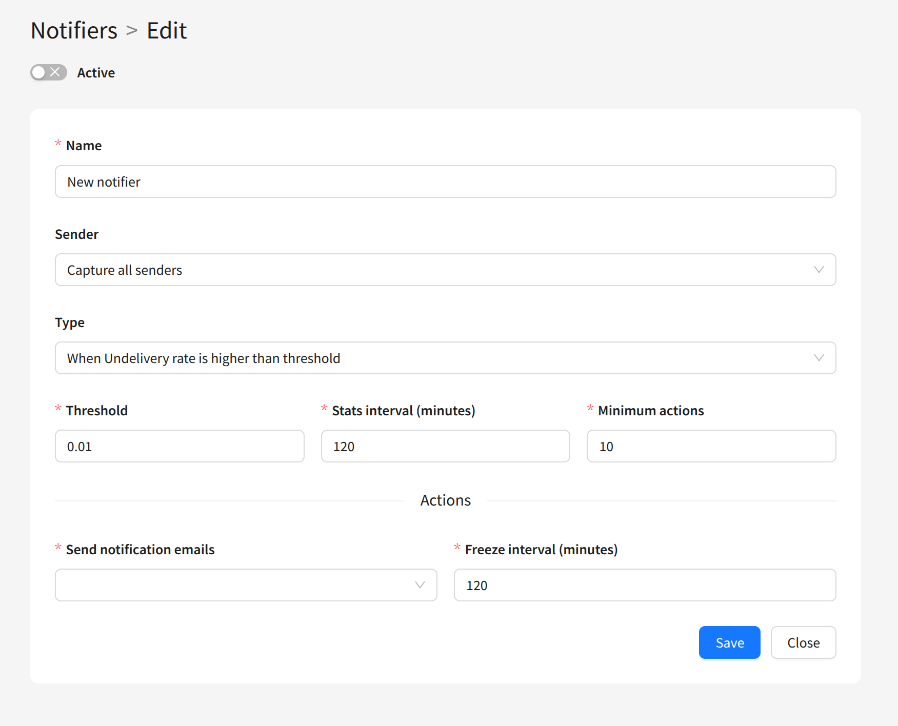- When Undelivery rate is higher than threshold — notification will be sent if the undelivery rate exceeds the specified threshold;