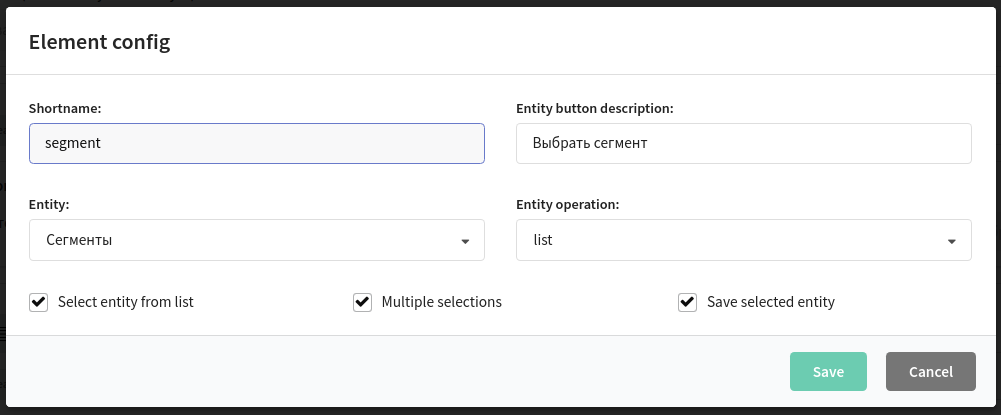 Select entity from list is available only for the List operation. If set, you will need to select from the list which data to save. Activates the Multiple selection and Save selected entity options for configuration.