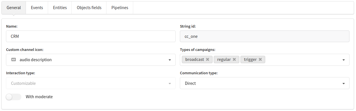 - direct - sending content personally to each profile (example Email, SMS, Push, etc.). Requires setting up subscription fields (at least one field in subscriptions must be set up in the channel);