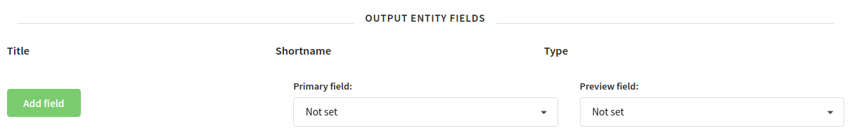 The structure of the external entity is specified in the Output Entity Fields section. This is a list of fields of different types. It is necessary to set the Primary field and Preview field. All operations (see below) must ultimately return either an error or the structure specified here (not all fields are possible).