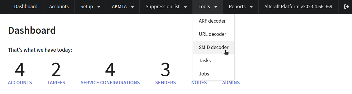 You can also use the aktool utility for decoding. Run the command ./aktool smid "<Any SMID>" in the terminal from the root directory of the platform, replacing <Any SMID> with the desired SMID. The command will return the same arguments as the decoder in the Admin Panel, but in plain text: