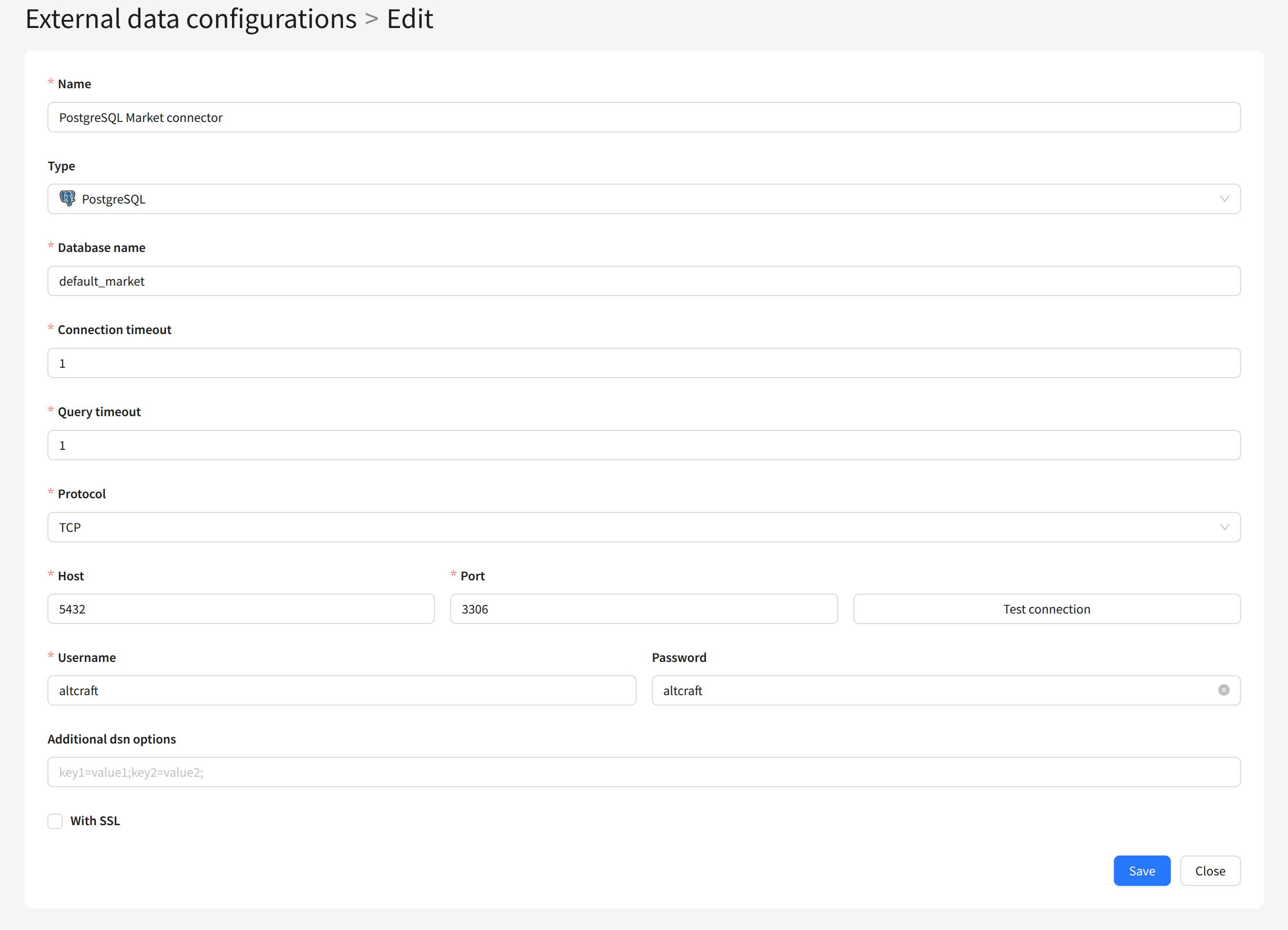 Select the connection type PostgreSQL. Specify the database name, host, port and credentials of the user created in PostgreSQL. To test the connection, click Test connection: