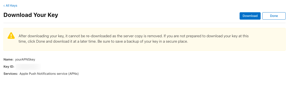 Apple Developer allows the created key to be downloaded only once. Make sure to store it securely. After download, it cannot be retrieved again: