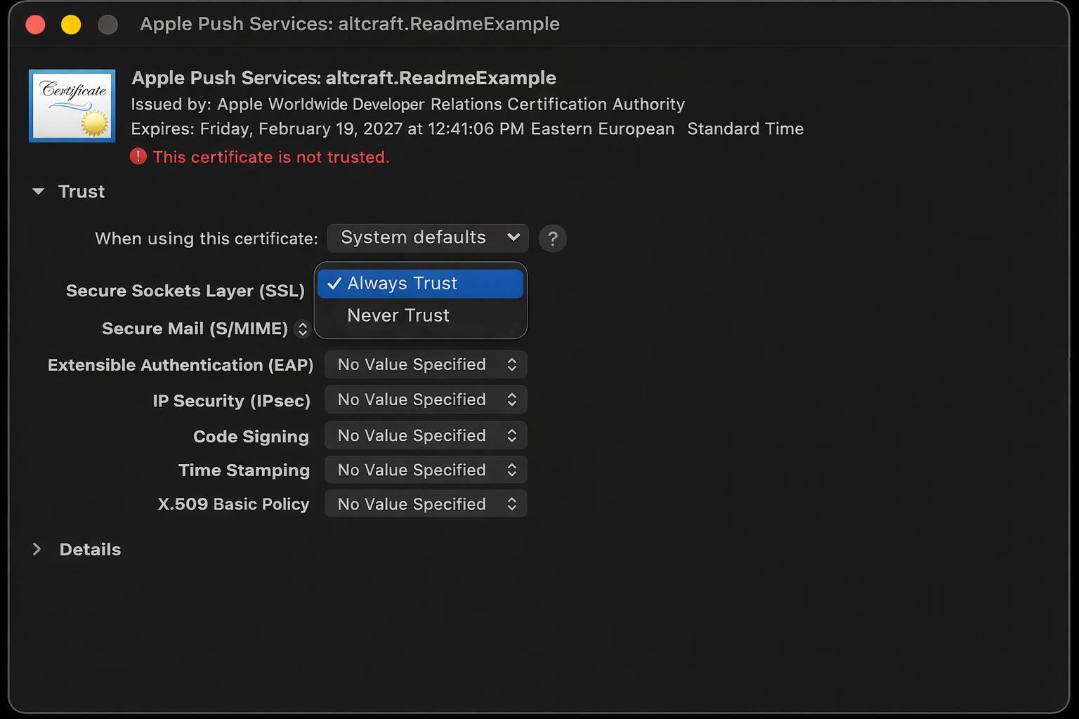 Download the created certificate. Open the downloaded file in Keychain Access. Double-click the certificate and set the trust level to Always Trust: