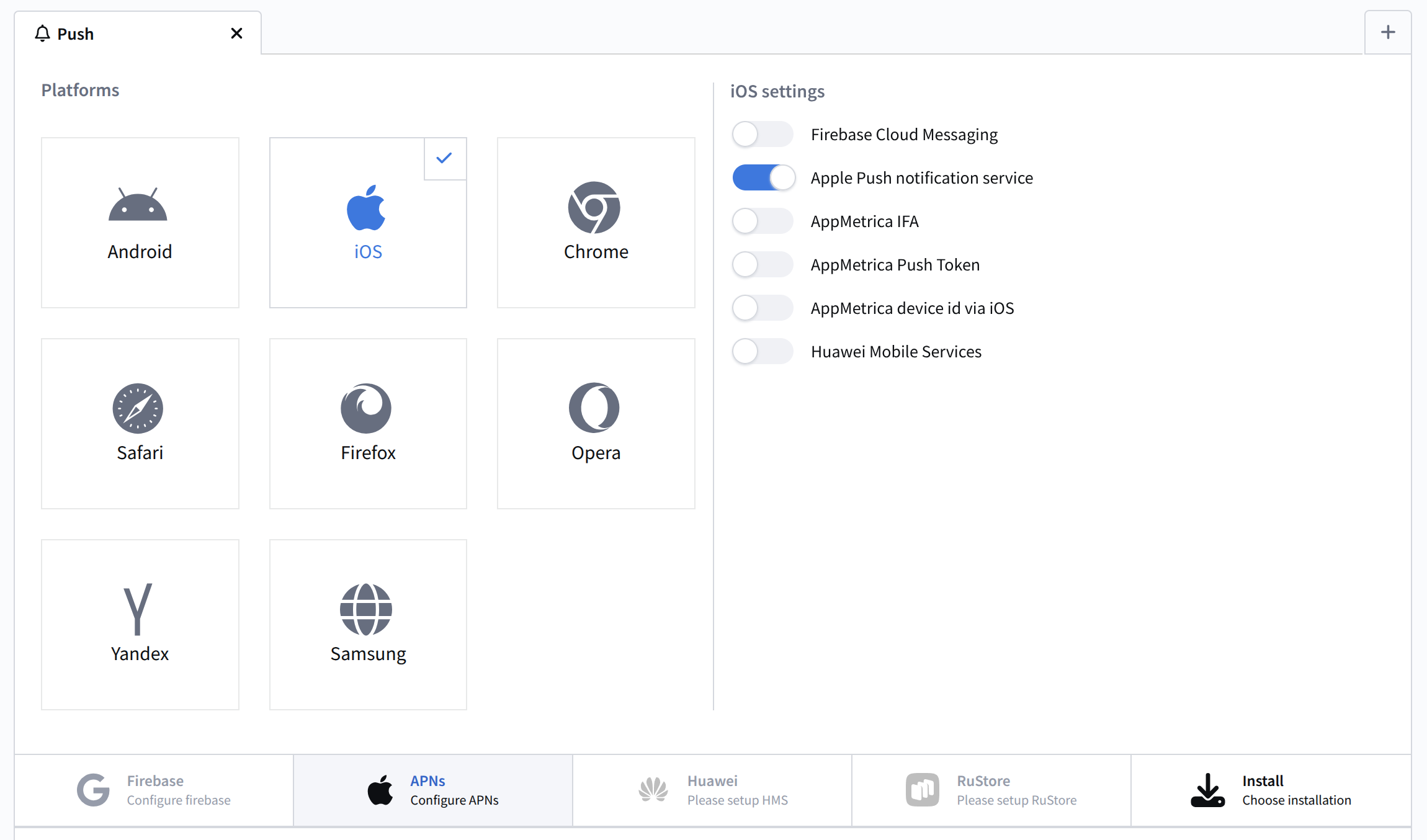 Configure the resource in the platform. Add a Push channel and enable Apple Push Notification service: