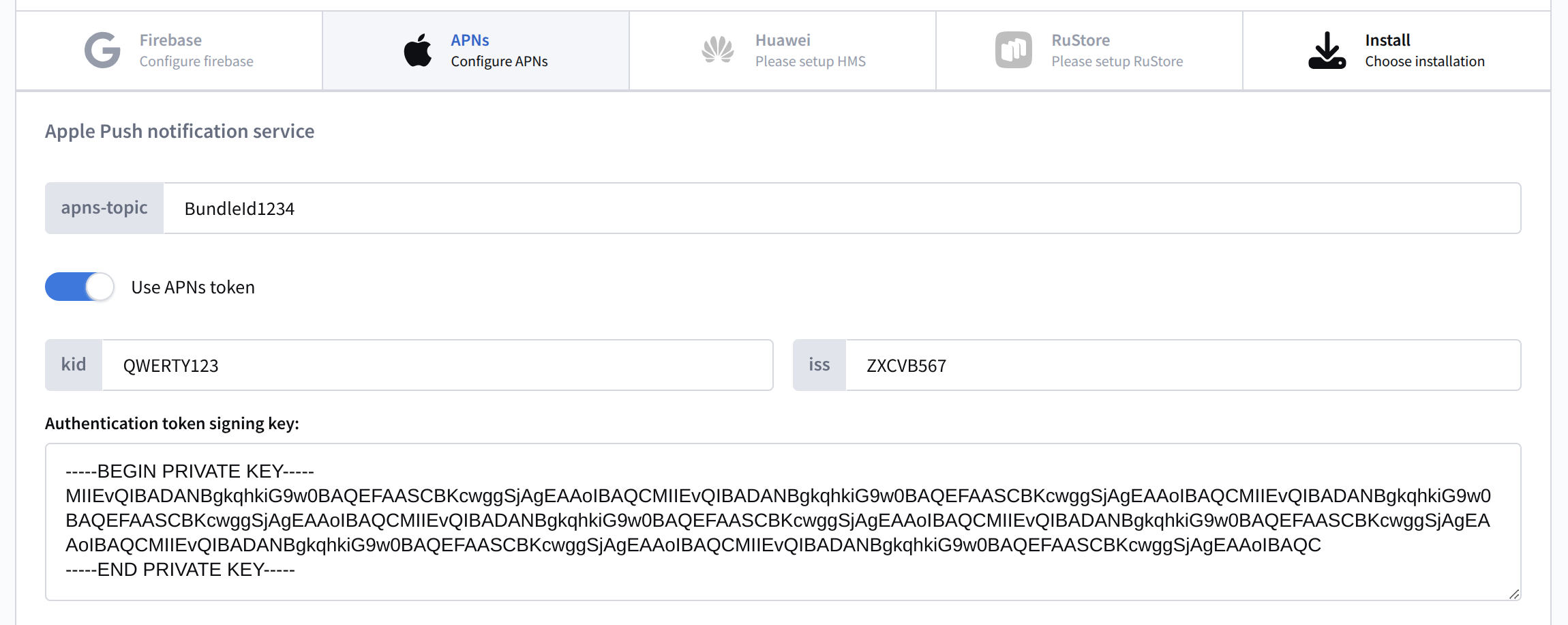- Signing key — the created Auth Key. To add it, open the downloaded p8 file in a text editor and copy its contents