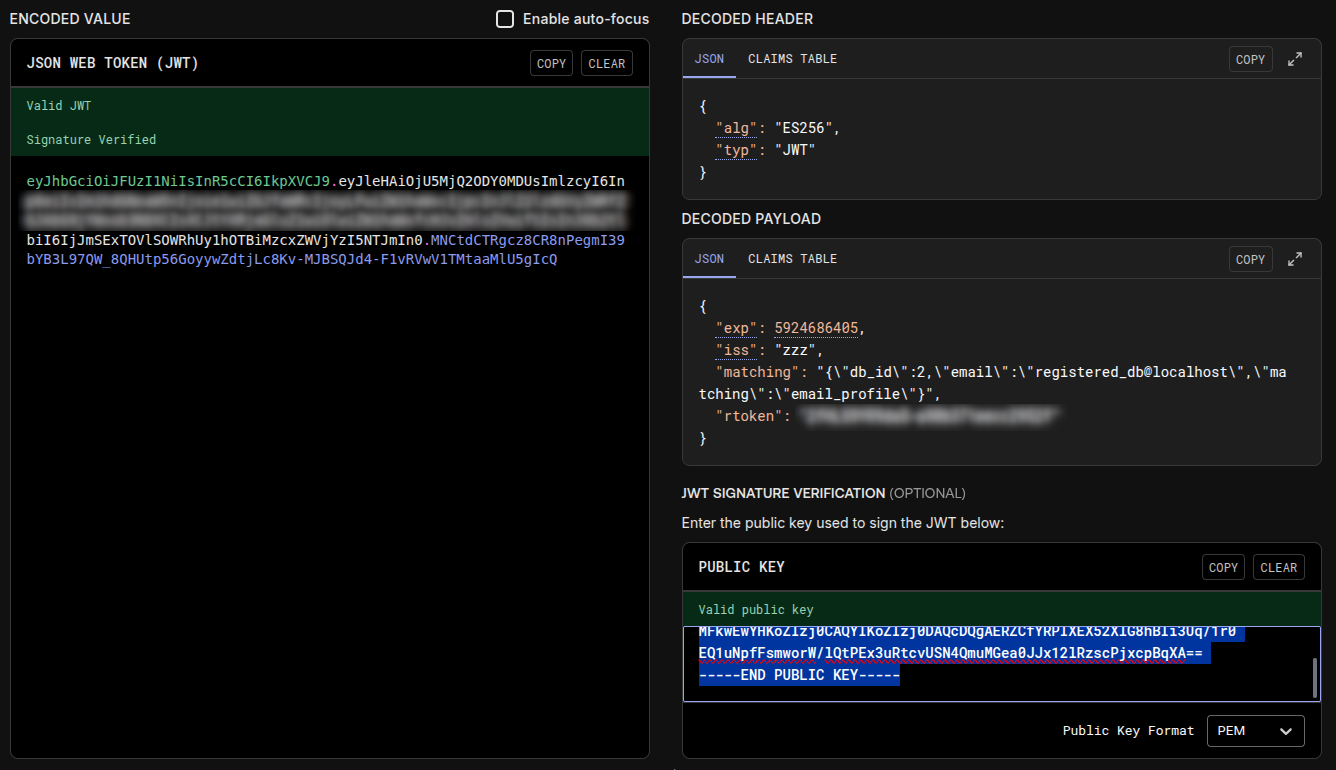 iss— issuer — unique identifier of the token issuerexp— expiration time — UNIX timestamp in secondsrtoken— the role token obtained during resource configurationmatching—JSONString— a serialized object composed according to the documentation, for example:{"db_id":2,"email":"registered_db@localhost","matching":"email_profile"}