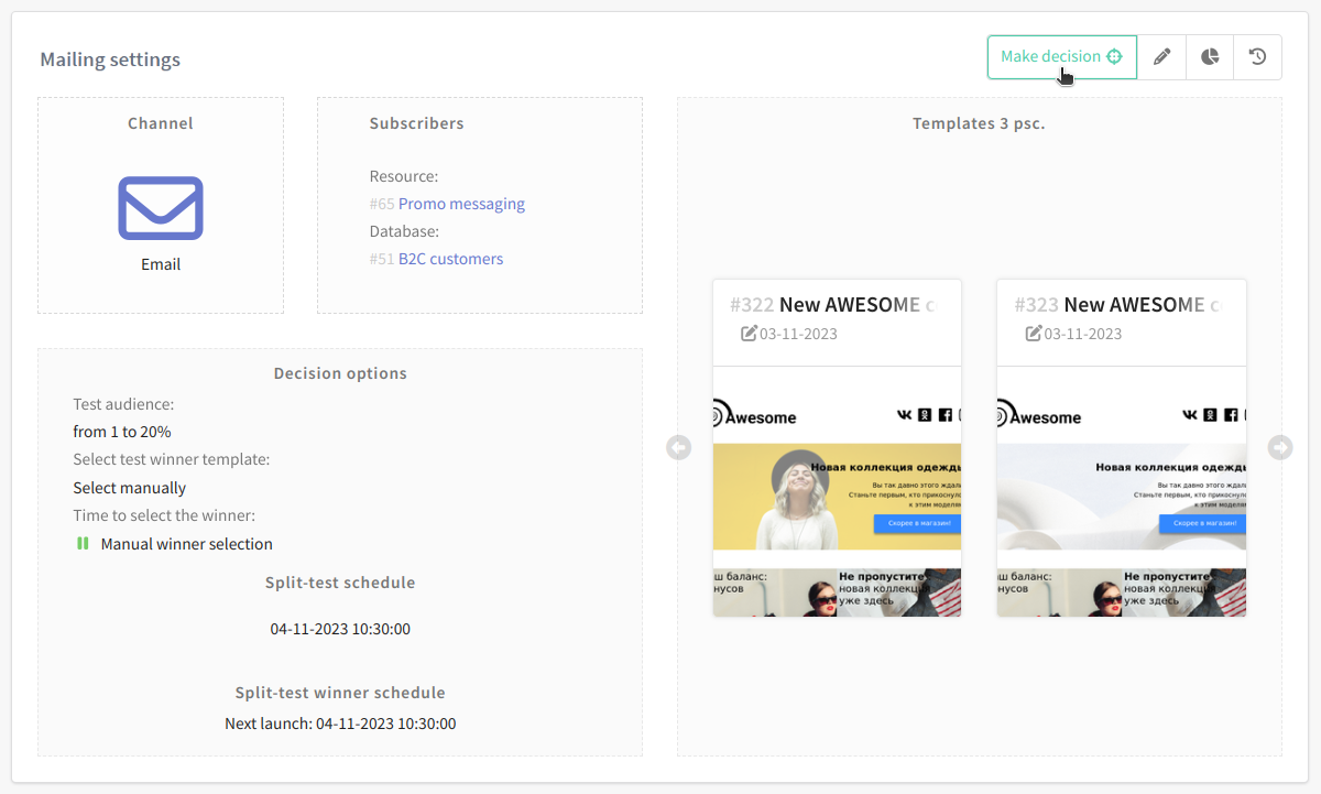At this step, you need to analyze the performance of each template and choose the winner template. To do this, click on the "Make a decision" button in the mailing editing window: